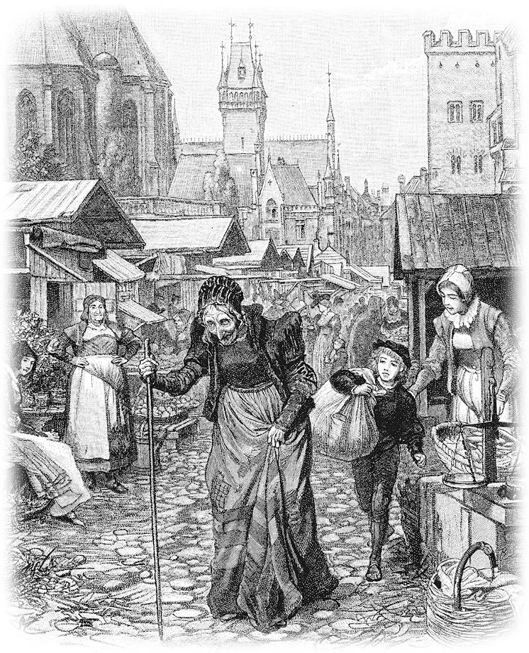 В это время на рынок пришла одна старуха. Она имела немного оборванный вид, маленькое острое лицо, совершенно сморщенное от старости, красные глаза и острый кривой нос, касавшийся подбородка.