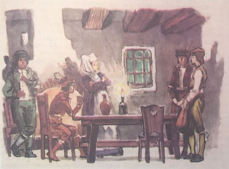Харчевня оказалась длинным, низким строением, перед ней стояла повозка, а рядом в конюшне, ржали лошади. Мастер поманил Феликса к окну, не закрытому ставнями. Став на цыпочки, можно было заглянуть внутрь. У печки спал в кресле мужчина, судя по одежде возчик, он же, вероятно, и хозяин повозки, что стояла во дворе. По другую сторону печки пряли женщина и девушка. За столом у стены сидел человек, перед которым стоял стакан вина, он сидел, подперев голову руками, так что лица его не было видно. Однако мастер решил, что, судя по одежде, он должен быть из благородных.