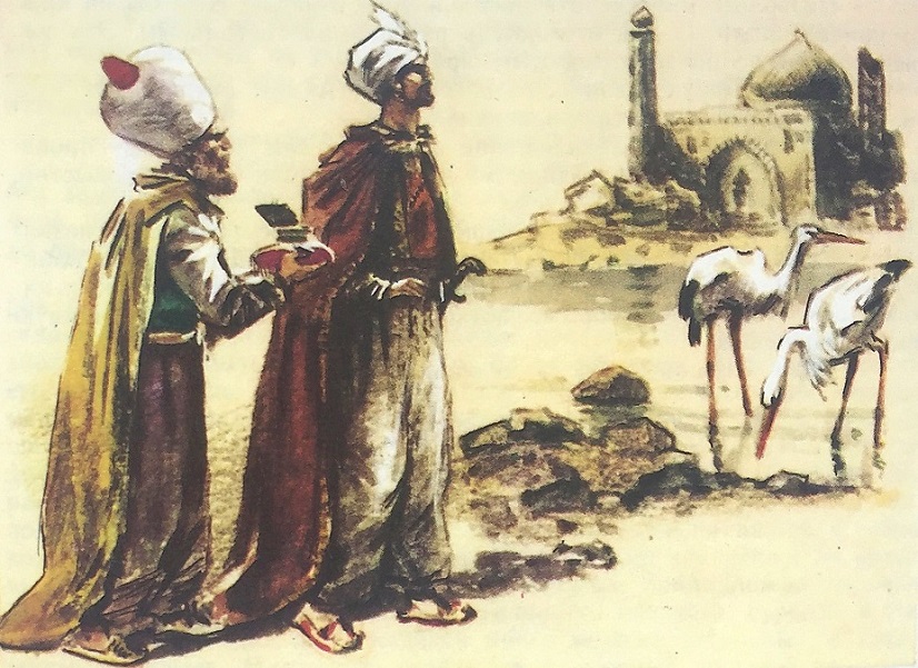 Калиф согласился на предложение своего визиря и вместе с ним отправился к пруду. Придя туда, они увидели аиста, который степенно шагал взад и вперед, отыскивая лягушек и что-то треща себе под нос. Одновременно они увидели высоко в небе второго аиста, летевшего к тому же месту.