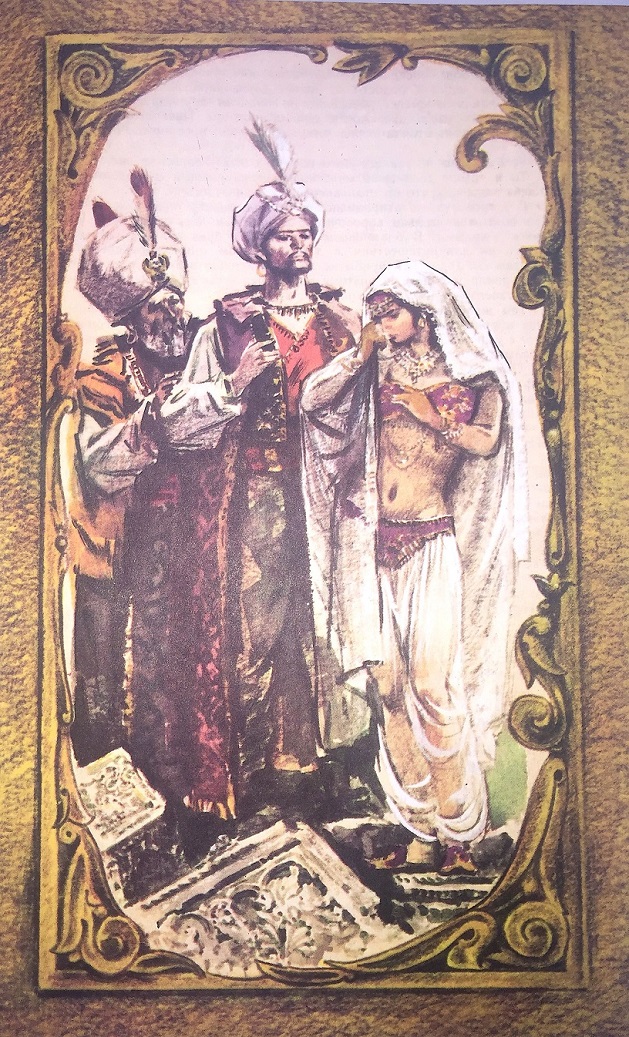 Однако калифу очень хотелось узнать, что сказано в рукописи, и он спросил визиря, не знает ли тот, кто бы мог разобрать ее.