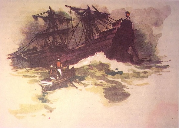 Я крепко обнял своего старого слугу, и мы поклялись держаться друг за друга до последней минуты. Наконец забрезжил рассвет; с первым проблеском зари ветер подхватил нашу лодку и опрокинул ее. Так я больше и не видал никого из экипажа корабля. От падения я лишился чувств; я пришел в себя в объятиях моего верного старого слуги, который спасся на опрокинутой лодке и втащил меня за собой. Буря утихла. Нашего корабля не было и в помине, но мы увидели неподалеку другой корабль, к которому нас несло волнами. Когда мы подплыли ближе, я узнал в нем тот самый корабль, который ночью промчался мимо нас и привел в такой ужас капитана. При виде этого корабля меня охватил неизъяснимый трепет: предсказание капитана, столь ужасно оправдавшееся, бездюдие на корабле, откуда при нашем приближении, несмотря на все оклики, никто не отзывался, внушали мне страх.
