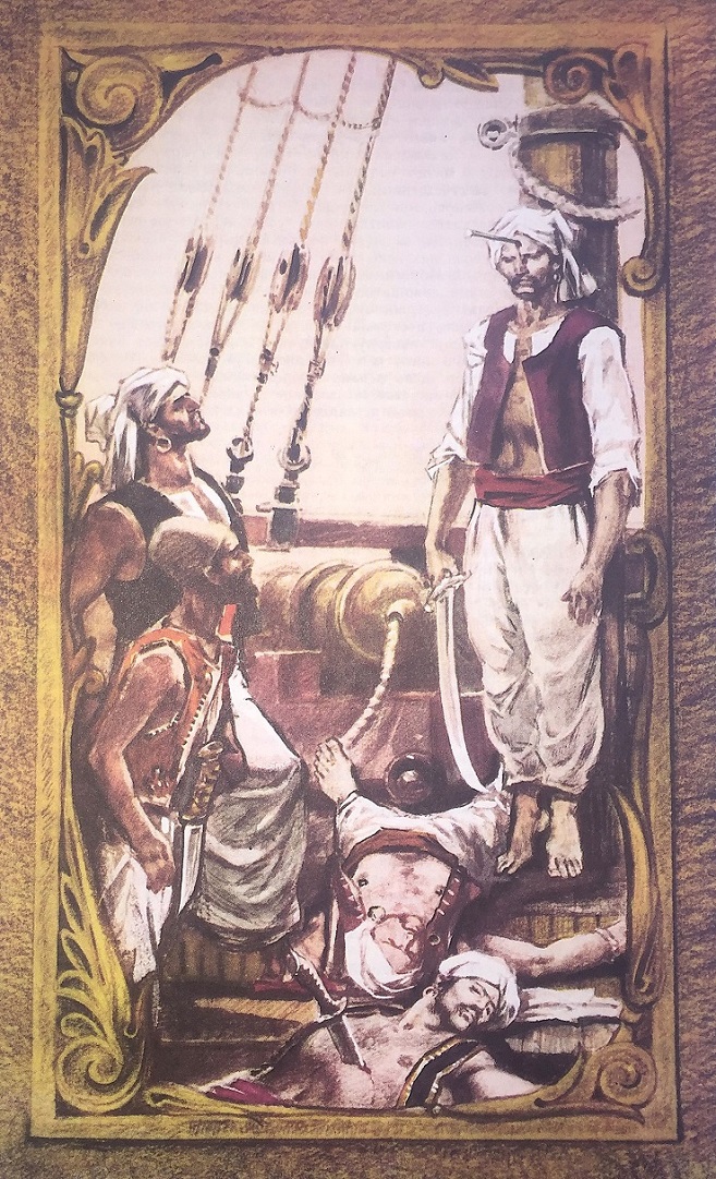 Но то была единственная возможность спастись, и мы возблагодарили пророка, который послал нам столь чудесное избавление. С носа корабля свисал длинный канат. Работая изо всех сил ногами и руками, подплыли мы к нему, чтобы за него ухватиться. Наконец нам это удалось. Я возвысил голос до крика, но на корабле по-прежнему царила тишина. Тогда мы стали взбираться вверх по канату, – я, как младший, впереди. Но, о, ужас! Что за зрелище представилось моим взорам, когда я взошел на палубу! Весь пол был залит кровью, двадцать или тридцать трупов в турецких одеждах лежали распростертые на полу; у грот-мачты стоял богато одетый человек с ятаганом в руке, но лицо у него было бледное и искаженное; воткнутым в лоб большим гвоздем он был приколочен к мачте и тоже мертв. Испуг сковал мне ноги, я не смел вздохнуть. Наконец наверх взобрался и мой спутник. И его поверг в ужас вид палубы, где не было ничего живого, – всюду одни лишь страшные трупы! Затем, обратившись в своем смятении с молитвой к пророку, мы решились идти дальше. После каждого шага мы оборачивались, не покажется ли что-нибудь новое, ещё более страшное, но все оставалось по-прежнему: куда ни глянь, вокруг ничего живого, только мы да океан. Даже говорить громко мы не смели из страха, что пригвожденный к мачте мертвый капитан обратит к нам взгляд своих неподвижных глаз либо один из убитых повернет голову в нашу сторону. Наконец мы добрались до лестницы, ведшей в трюм. Мы невольно остановились и взглянули друг на друга: ни один из нас не решался высказать свои мысли вслух.