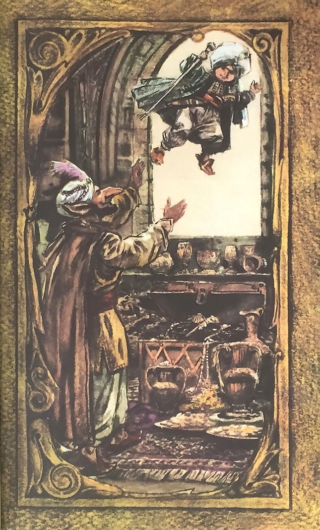 Оказавшись владельцем таких богатств, Маленький Мук решив что отныне все пойдет по-новому и что теперь многие его враги из числа придворных станут его рьяными защитниками и покровителями. Из этого одного ясно, что добряк Мук не получил тщательного воспитания, иначе бы он не мог вообразить, будто деньгами приобретаются истинные друзья. Ах! Отчего он тогда не надел своих туфель и не улетучился, прихватив халатик, наполненный золотом!
