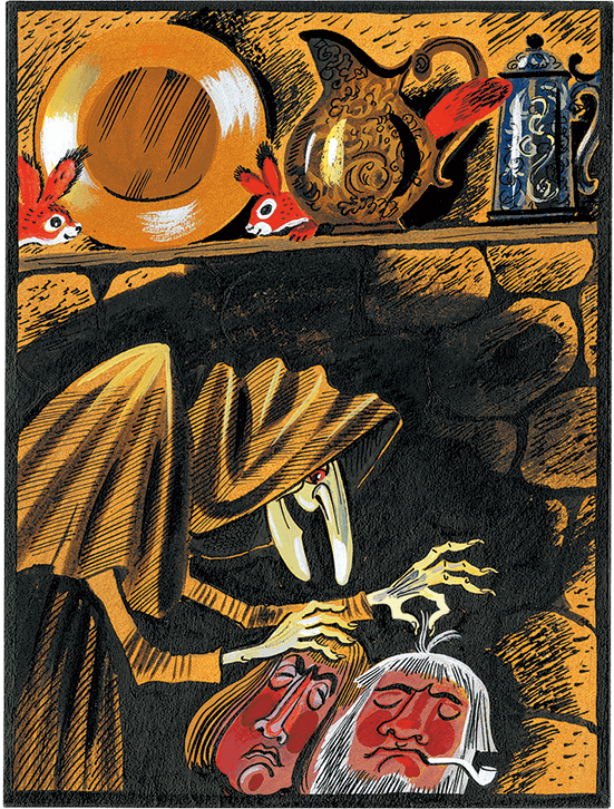 Когда Якоб почти что доел суп, свинки зажгли на маленькой жаровне какое-то куренье с приятным запахом, и по всей комнате поплыли облака голубоватого дыма. Он становился всё гуще и гуще, всё плотней и плотней окутывал мальчика, так что у Якоба наконец закружилась голова. Напрасно говорил он себе, что ему пора возвращаться к матери, напрасно пытался встать на ноги. Стоило ему приподняться, как он снова падал на диван – до того ему вдруг захотелось спать. Не прошло и пяти минут, как он и вправду заснул на диване, в кухне безобразной старухи.