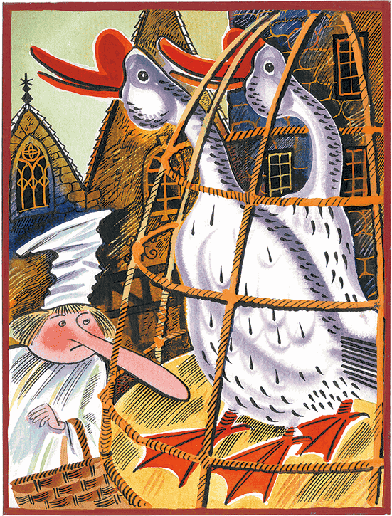 Расхаживая взад и вперёд, Якоб вдруг заметил в конце базара, в стороне от других торговок, одну женщину, которую не видел раньше. Она тоже продавала гусей, но не расхваливала свой товар, как другие, а сидела молча, не говоря ни слова. Якоб подошёл к этой женщине и осмотрел её гусей. Они были как раз такие, как он хотел. Якоб купил трёх птиц вместе с клеткой – двух гусаков и одну гусыню, – поставил клетку на плечо и пошёл обратно во дворец. И вдруг он заметил, что две птицы гогочут и хлопают крыльями, как полагается хорошим гусакам, а третья – гусыня – сидит тихо и даже как будто вздыхает.