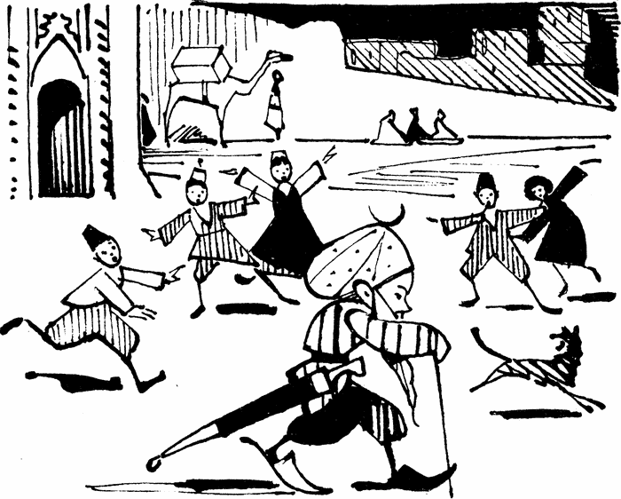 Я и мои товарищи были злые мальчишки и любили дразнить прохожих. Когда Маленький Мук выходил из дому, для нас был настоящий праздник. В этот день мы толпой собирались перед его домом и ждали, пока он выйдет. Вот осторожно раскрывалась дверь. Из неё высовывалась большая голова в огромной чалме[1]. За головой следовало всё тело в старом, полинялом халате и просторных шароварах. У широкого пояса болтался кинжал, такой длинный, что трудно было сказать – кинжал ли прицеплен к Муку или Мук прицеплен к кинжалу.