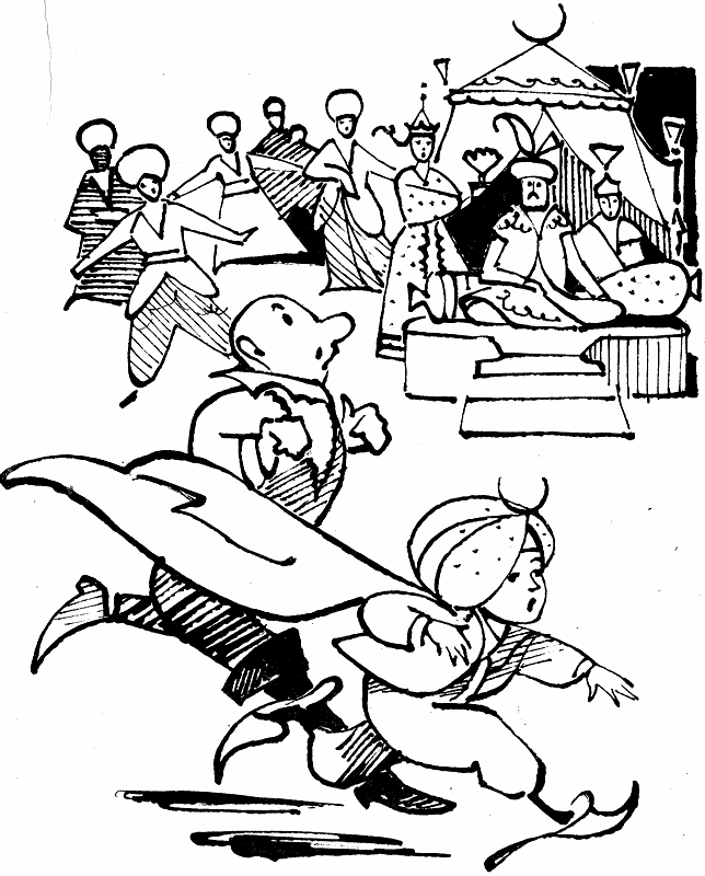 Он захватил тросточку и бегом побежал к себе в комнату. В одну минуту он надел плащ и чалму, прицепил кинжал и помчался вниз по лестнице, торопясь уйти до возвращения старухи.