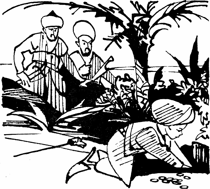 Как-то раз он гулял в отдалённом углу сада, и вдруг тросточка у него в руках задрожала и три раза ударила о землю. Маленький Мук весь затрясся от волнения. Он побежал к садовнику и выпросил у него большой заступ[2], а потом вернулся во дворец и стал ждать, когда стемнеет. Как только наступил вечер, карлик отправился в сад и начал копать в том месте, где стукнула палочка. Заступ оказался слишком тяжёл для слабых рук карлика, и он за час выкопал яму глубиной в каких-нибудь пол-аршина[3].