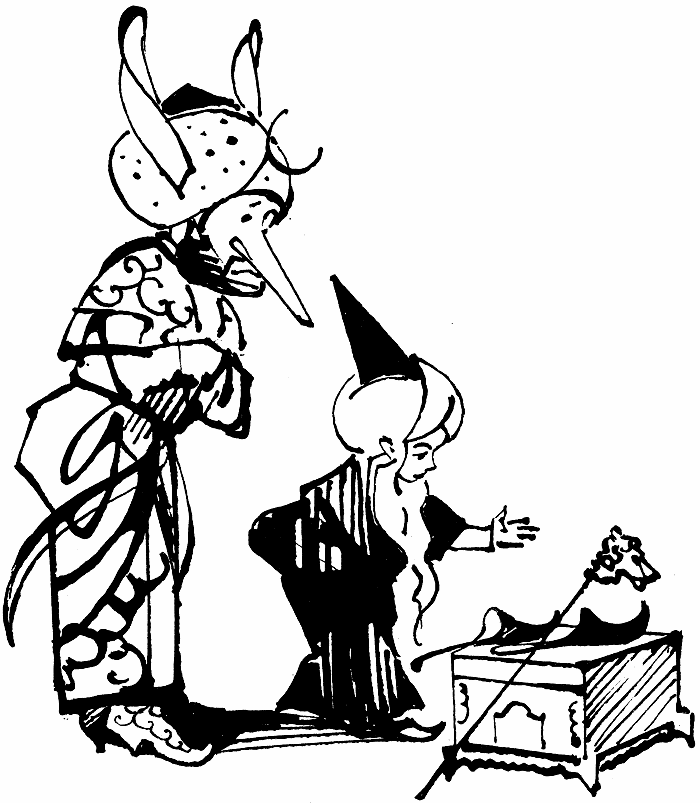 Маленького Мука очень огорчало, что придворные ему так завидуют. Он долго старался что-нибудь придумать, чтобы они его полюбили. И наконец он вспомнил про свою тросточку, о которой совсем было позабыл.