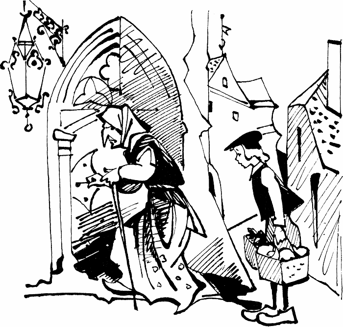 И вдруг к ним подошла какая-то бедно одетая старуха с маленькими красными глазками, острым, сморщенным от старости личиком и длинным-предлинным носом, который спускался до самого подбородка. Старуха опиралась на костыль, и удивительно было, что она вообще может ходить: она хромала, скользила и переваливалась, точно у неё на ногах были колёса. Казалось, вот-вот она упадёт и ткнётся своим острым носом в землю.