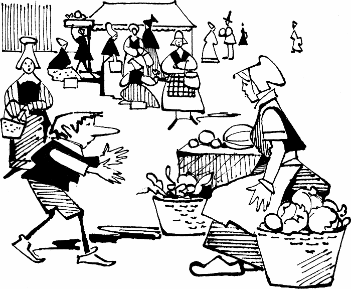 – Эй ты, бессовестная старуха! – крикнул он. – Перенюхала всю зелень своим длинным носом, перемяла корешки корявыми пальцами, так что теперь их никто не купит, и ещё ругаешься, что плохой товар! У нас сам герцогский повар покупает!