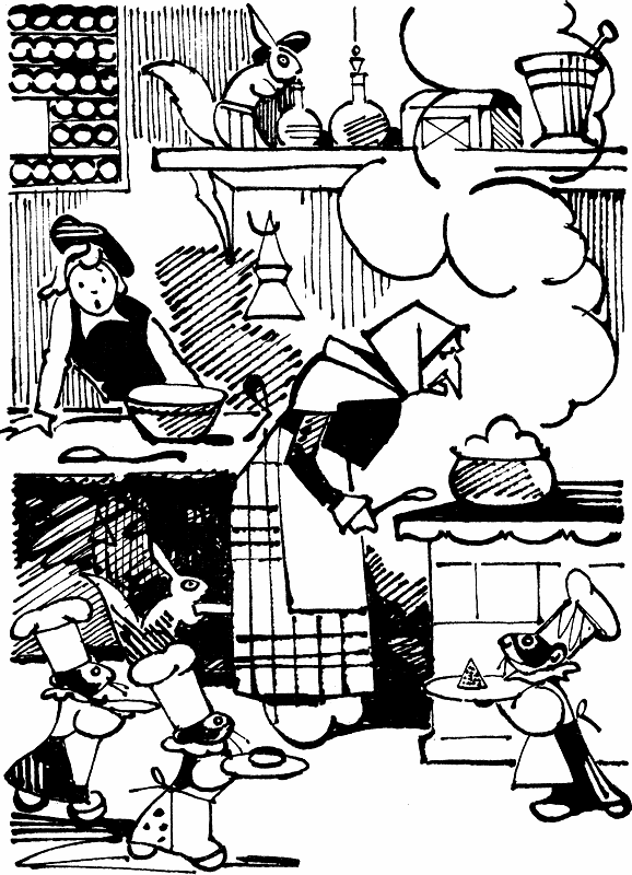 Она снова свистнула в свой свисток, и на кухню примчались морские свинки, одетые как люди: в передниках, с поварёшками и кухонными ножами за поясом. За ними прибежали белки – много белок, тоже на двух ногах; они были в широких шароварах и зелёных бархатных шапочках. Это, видно, были поварята. Они быстро-быстро карабкались по стенам и приносили к плите миски и сковородки, яйца, масло, коренья и муку. А у плиты суетилась, катаясь взад и вперёд на своих кокосовых скорлупках, сама старуха – ей, видно, очень хотелось сварить для Якова что-нибудь хорошее. Огонь под плитой разгорался всё сильнее, на сковородках что-то шипело и дымилось, по комнате разносился приятный, вкусный запах. Старуха металась то туда, то сюда и то и дело совала в горшок с супом свой длинный нос, чтобы посмотреть, не готово ли кушанье.