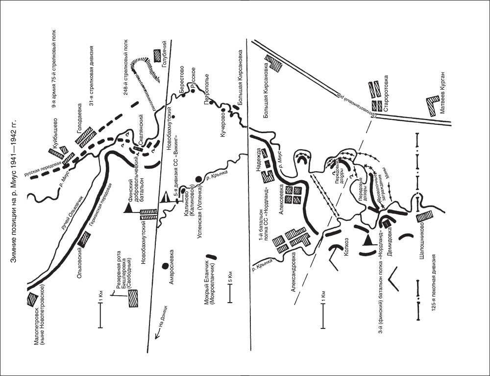 В качестве таковой был выбран взвод 1-й роты во главе с командиром взвода, финном унтерштурмфюрером СС Ингере. Прежде всего Ингере и его люди на основании наблюдений с передовых позиций составили схему расположения позиций русских, отметив на ней расположение постовых, маршруты инспекционных обходов русскими офицерами своих позиций. На схему нанесли также расположение минных полей и проходов в них, проволочные заграждения и наиболее удобные места перехода через замерзший Миус.