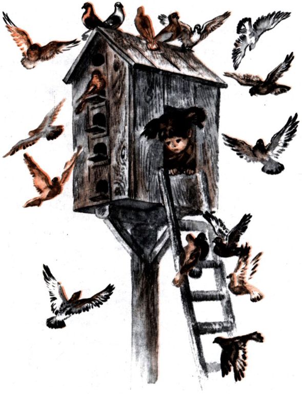 – Веронка, у меня же только голова снаружи, – плакала Агатка, – а голову на лестницу не поставишь. А если повернусь и высуну из голубятни ноги, тогда лестницы не увижу: куда мне ногу-то ставить?