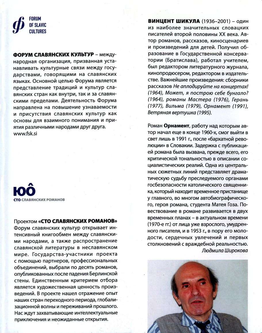 Роман В. Шикулы «Орнамент» – третье произведение словацкой прозы, изданное «Центром книги Рудомино» в рамках серии «Сто славянских романов» – международного проекта, преследующего благородную цель сближения славянских народов путем взаимного ознакомления с лучшими образцами современных национальных литератур. Ранее были опубликованы романы «Помощник» Л. Баллека (перевод Н. Замошкиной, 2013) и «Конец игры» Д. Митаны (перевод Н. Шульгиной, 2017).