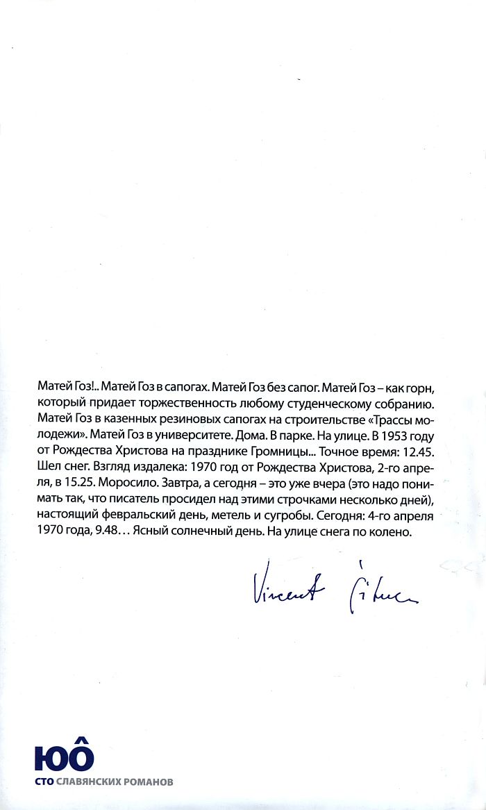 В романе прослеживается дальнейшая судьба Матея Гоза. Герой-повествователь, в образ которого писатель вложил немало автобиографических черт, оказывается под давлением многих бытовых и нравственных проблем, которые ему приходится решать. Мелкие неурядицы в семье перерастают в полное непонимание, а затем и в разрыв с женой; Эва оставляет Матея и вместе с маленьким сыном уходит к родителям. Героя гнетет внутренняя раздвоенность, усталость от лжи и лицемерия, метания между вспыхнувшими чувствами к Иренке и долгом перед семьей, душевная опустошенность. Тщетные поиски пропавшего Йожо Патуца завершаются печально: в затерянном цыганском поселке на востоке Словакии Матею передают записную книжку друга и его простреленную шляпу.
