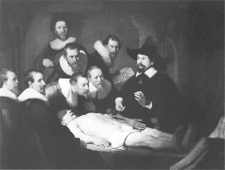 Стоя сегодня в музее Маурицхёйс перед анатомической картиной Рембрандта размером два на полтора метра, мы оказываемся на месте тех, кто в свое время наблюдал процедуру вскрытия в Палате мер и весов, и думаем, что видим то, что видели они: лежащий на переднем плане зеленоватый труп Ариса Киндта со сломанной шеей и выпирающей наружу в посмертном окоченении грудной клеткой. И все же сомнительно, что кто-нибудь и впрямь видел этот труп, ведь возникшее как раз тогда искусство вскрытия не в последнюю очередь стремилось сделать виновное тело невидимым. И что характерно: взгляды коллег доктора Тульпа направлены не на тело как таковое, но как бы чуть мимо, на раскрытый анатомический атлас, в котором жуткая телесность сведена к диаграмме, к схеме человека, как ее вообразил себе страстный анатом-любитель Рене Декарт, также присутствовавший в то январское утро в Палате мер и весов. Как известно, рассуждая о смирении перед Божественной мудростью, Декарт учил, что следует отвлечься от плоти и сосредоточиться на уже заложенной в нас машине, на том, что можно полностью понять, сделать полезным для работы и, при любых помехах, либо снова привести в движение, либо выбросить вон. Странной отторженности тела, как-никак выставленного на всеобщее обозрение, соответствует и то, что хваленая достоверность Рембрандтовой картины при ближайшем рассмотрении оказывается мнимой. Вопреки традиции изображенная здесь процедура начинается не с вскрытия живота и удаления кишечника, быстрее всего подвергающегося разложению, но с рассечения преступной руки (что также указывает, вероятно, на акт возмездия). И рука эта опять-таки своеобразна. Она не только гротескно непропорциональна по сравнению с рукой, ближней к зрителю, но совершенно искажена анатомически. Обнаженные сухожилия, которые, судя по положению большого пальца, располагаются на левой ладони, на самом деле – сухожилия тыльной стороны правой руки. Значит, речь идет о чисто технической накладке, о детали, попросту взятой из анатомического атласа, но из-за нее картина, написанная, так сказать, с натуры, именно в своем смысловом центре, там, где разрезы уже сделаны, оборачивается вопиюще неудачной конструкцией. То, что Рембрандт здесь как-то оплошал, вряд ли возможно. Мне, скорее, кажется, что он умышленно нарушил композицию. Изуродованная рука – знак насилия, совершенного над Арисом Киндтом. Художник отождествляет себя с ним, с жертвой, а не с гильдией, сделавшей ему заказ. У него одного нет застывшего картезианского взгляда, только он видит это угасшее, зеленоватое тело, видит тень на полуоткрытых губах и над глазом мертвеца.