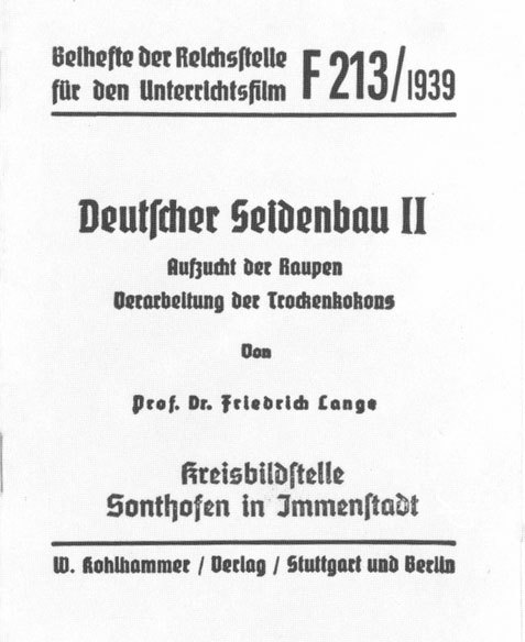 Лицензированная рейхсгруппа шелководов, Берлин, в составе рейхсобъединения германских животноводов (секция «Мелкие домашние животные»), входящего в рейхссословие кормильцев общества, ставит перед собой следующие цели: повышение производительности на всех имеющихся предприятиях, агитация за шелководство через прессу, кино и радио, создание образцовых питомников гусениц как центров обучения, поощрение всех шелководов путем организации окружных, областных и местных профессиональных правлений, посадка миллионов тутовых деревьев на незанятых землях, в населенных пунктах и на кладбищах, на железнодорожных насыпях и на обочинах шоссе. Значение шелководства для Германии, рассуждает профессор Ланге, автор брошюры F212/1939, состоит не только в том, что прекратятся обременительные закупки за границей, но и в той важной роли, которая отводится шелку в поступательном развитии независимой экономики. По этой причине и в школах следует пробуждать интерес немецкой молодежи к шелководству, хотя и не насаждать его принудительно, как во времена Фридриха Великого. Намного правильнее добиваться, чтобы учителя и ученики занимались этим делом по своему свободному выбору. Если тщательно продумать новые возможности школьной работы в области шелководства, пишет профессор Ланге, то можно было бы окаймлять школьные дворы тутовыми деревьями и разводить гусениц шелковичного червя в школьных помещениях. В конце концов, шелковичная гусеница, присовокупляет профессор Ланге, помимо своей явной ценности является почти идеальным учебным пособием. Ее можно весьма дешево получать в любых количествах и содержать как ручное домашнее животное без клеток или загонов. На любой стадии развития она пригодна для самых различных опытов (взвешиваний, измерений и т. п.): для демонстрации строения и особенностей насекомого, равно как и для других мероприятий, необходимых человеку в воспитательной работе, а именно для приручения, изучения негативных мутаций, контроля за производительностью, отбора и умерщвления во избежание деградации расы. В самом фильме можно увидеть, как шелководы государственного питомника в городе Целле принимают присланный материал, как они раскладывают его в чистые ящики, как происходит линька и кормление голодных гусениц, многократное перекладывание, прядильная работа на плетеных решетках и, наконец, умерщвление. Если прежде для уничтожения коконы выкладывали на солнце или заталкивали в разогретые печи, то теперь их сваливают в котел, вмурованный в стену и постоянно кипящий. Распластанные в плоских коробках коконы должны были три часа лежать над паром, поднимающимся из чана. Покончив с одной массой, шелководы тут же брались за следующую, пока полностью не заканчивали дело уничтожения.