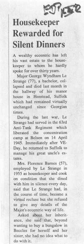 Если верить статье, Лестрейндж, нанимая эту экономку, простую молодую женщину из поселка Бекклз по имени Флоренс Барнс, поставил непременное условие: она должна была готовить пищу и разделять с ним трапезы, но при этом хранить абсолютное молчание. Видимо, сама миссис Барнс сообщила газете, что честно выполняла поставленное ей условие даже тогда, когда Лестрейндж стал вести себя все более эксцентрично. Правда, миссис Барнс, подвергаясь весьма настойчивому допросу со стороны газетчика, высказывалась крайне сдержанно, но и мои собственные, предпринятые несколько позже разыскания подтвердили, что с конца пятидесятых Лестрейндж постепенно уволил всех домашних слуг, а также сельскохозяйственных рабочих, садовников и управляющих. Он жил один в большом каменном доме с молчаливой кухаркой из Бекклза, а потому все имение, сады и парк дичали, а невспаханные поля зарастали сорняками и кустарником. Кроме этих показаний, оставленных свидетелями упадка имения, в соседних деревнях ходили слухи, касавшиеся самого майора, возможно, не совсем заслуживающие доверия. Они основывались на том немногом, что просачивалось к общественности из глубины парка, а потому особенно занимало более узкие круги местного населения. Так, например, в одном трактире в Хенстеде я слышал, что Лестрейндж под старость совершенно сносил свой гардероб, но терпеть не мог надевать новые вещи и разгуливал в старинной одежде, которую, по мере надобности, извлекал из сундуков на чердаке своего дома. Находились люди, утверждавшие, что видели его несколько раз в сюртуке канареечного цвета или в чем-то вроде траурного плаща из траченной молью тафты со множеством пуговиц и петель. Еще говорили, что Лестрейндж, имевший привычку держать в своей комнате ручного петуха, к тому же был постоянно окружен всевозможными пернатыми: цесарками, фазанами, голубями и перепелами и самыми разными садовыми и певчими птицами; они либо бегали за ним по земле, либо сопровождали его по воздуху. Рассказывали, что однажды летом Лестрейндж выкопал в своем саду яму, где сидел днем и ночью, как святой Иероним в пустыне. Но самой удивительной была байка, сочиненная, как я полагаю, служащими похоронного бюро в Рентеме. Говорили, что светлая кожа майора во время его кончины позеленела, приобрела оливковый оттенок; серые, как у гуся, глаза стали темно-синими, а соломенного цвета волосы почернели, как вороново крыло. И что прикажете думать о таких историях? Наверняка известно лишь то, что парк со всеми прилегающими угодьями в прошлом году был продан с молотка какому-то голландцу. Флоренс Барнс, верная домоправительница, вместе со своей сестрой Джемаймой живет в родном поселке Бекклз.