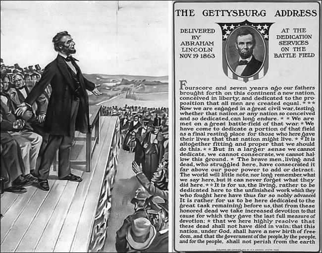 Двухминутная речь, состоявшая из 10 предложений и 272 слов, произнесенная президентом США Авраамом Линкольном на открытии Геттисбергского кладбища 19 ноября 1863 г., стала памятником США, историческим и даже архитектурным – полный текст ее высечен на огромной каменной плите Мемориала Линкольну в Вашингтоне.