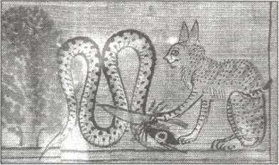 В Книге мертвых имеется описание сражения между нашим светилом и змеем: «Войдя через хвост гигантской змеи, Аф обратился в жука. Свет Анубиса остается в стороне от заката. Двенадцать усердных слуг тянут Мадит, утреннюю лодку, на восток, в то время как бывшее тело Афа лежит распластанным на песчаной дюне. Это означает самый конец путешествия. Черное солнце избежало уничтожения, призвав на защиту всех последователей света. Начинается новое путешествие, новая одиссея к высшей точке. Тутмос воскрес. Сын Тота принадлежит семье негаснущих звезд». рис. 69.Бог Солнца Ра в образе кота расчленяет змея Апопа