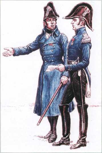 Офицеры карабинерских полков в малой выходной зимней форме. Офицер в рединготе и офицер в форме для грязного времени, 1810–1815 гг.