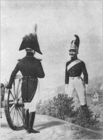 Обер-офицер и бомбардир конной артиллерии, 1809–1811 гг. из книги «Историческое описание одежды и вооружения…».