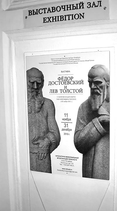 Афиша совместной выставки «Федор Достоевский и Лев Толстой», организованной тремя музеями: Литературно-мемориальным музеем Ф. М. Достоевского, Государственным музеем Л. Н. Толстого (Москва), Музеем-усадьбой Л. Н. Толстого «Ясная Поляна» в Санкт-Петербурге в связи со 100-летием со дня смерти Льва Толстого. 11 ноября – 31 декабря 2010 г.