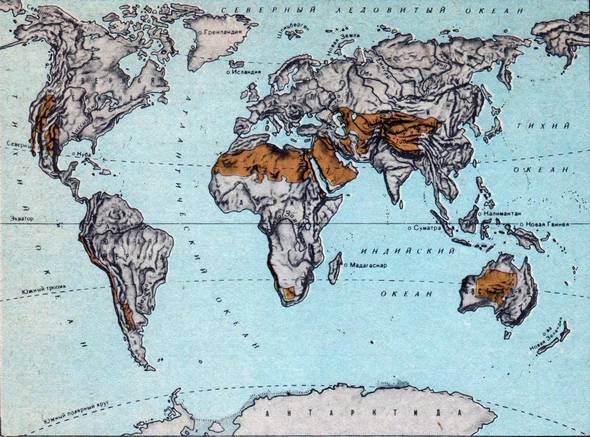 В Советском Союзе пустыни с полупустынями образуют широкий пояс между 36 и 46° (местами до 50°) с.ш. и между 48 и 82° в.д., охватывая огромную территорию, около 300 млн. га, от Апшеронского п-ова и левобережья дельты Волги до восточных границ Кызылкума, Мойынкума, песков Сарыесик-Атырау (Бабаев, Фрейкин, 1977).