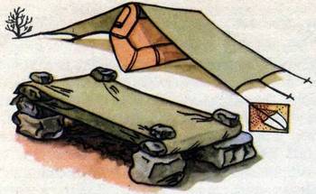 Если растительность отсутствует, тент можно закрепить с помощью песчаных якорей – мешочков из кусков ткани размером 0,5х0,5 м, заполненных песком. Шесть-восемь таких якорей, привязанных к растяжкам и закопанных на глубину 40-60 см, надежно удерживают тент в ветреную погоду. Для центральной стойки можно использовать спасательную лодку. Ее надувают и, подведя под центр полотнища, ставят набок (рис. 73а). Чтобы сооружение не разрушилось при сильных порывах ветра, лодку, поставив на корму, вкапывают на 1/3 длины в песок. При отсутствии лодки для стойки можно использовать любой подходящий предмет: черенок лопаты, связанные между собой ножи мачете и т.д. Если она все же коротка и тент нависает над головой, пространство под ним углубляют, оставив нетронутым песок лишь вокруг стойки. Укрытие от прямой солнечной радиации можно сделать в виде неглубокой (0,5-0,8 м) траншеи, прикрыв ее сверху тканью и закрепив края камнями (рис. 73б). Тент лучше сделать сдвоенным, чтобы между полотнищами оставалась изолирующая воздушная прослойка.