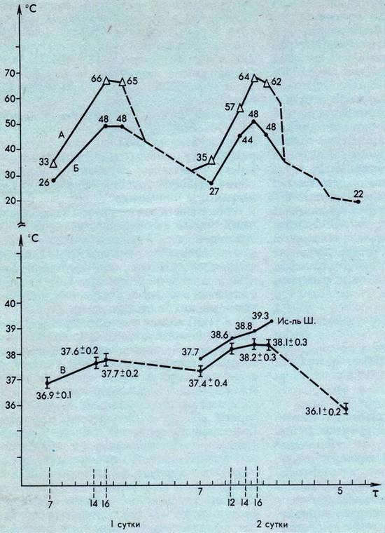 Несомненный интерес представляет зависимость температуры тела от изменений температуры окружающей среды. В экспериментах, проводившихся нами в 1967-1982 гг. в утренние относительно прохладные часы (температура воздуха 18-23°), температура тела у испытуемых удерживалась в пределах 36,0-36,2°. В дневные часы наблюдалось повышение ее на 1,5-2° с максимумом, совпадающим с «пиком» температуры воздуха в 14-15 часов. Затем она постепенно начинала снижаться, возвращаясь к исходной утренней. Наиболее значительные ее цифры были зарегистрированы в дни, когда температура воздуха в тени достигала 44-48° (рис. 74).