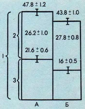 Рис. 76. Объем водных пространств организма до (А) и после (В) эксперимента в термокамере. 1 —Общая вода тела, 2 – внеклеточная жидкость (бромное пространство), 3 – внутриклеточная вода