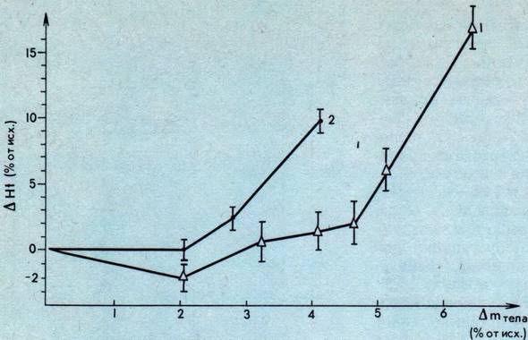 Изучение структуры водопотерь показало, что при потере массы тела до 4,0-4,5% обезвоживание происходит за счет внесосудистой экстрацеллюлярной жидкости, при дефиците от 4,5 до 6,0% объем циркулирующей плазмы (ОЦП) уменьшается на 15-20%. В дальнейшем при потере массы тела до 8-10% уменьшение ОЦП и внеклеточной жидкости хотя в целом и не прогрессировало, но происходило уменьшение внутриклеточной воды (рис. 76).