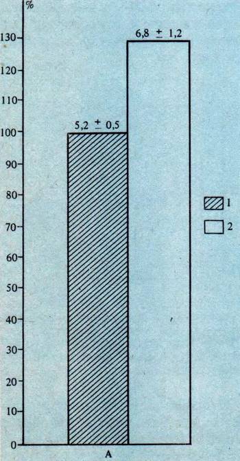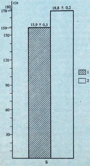 Рис. 78. Изменение некоторых показателей крови в трехсуточном эксперименте (А – вязкость крови, Б – содержание гемоглобина в крови); 1 – до эксперимента, 2 – после эксперимента