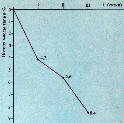 Определение общей воды тела (ОВТ) прямым методом с помощью радиоактивного изотопа водорода – трития (Н3), выполненное И. П. Бобровницким, показало, что в абсолютном отношении снижение содержания воды в организме (л) меньше величины теряемой массы тела (кг). За трехсуточный эксперимент потеря около 0,8 кг из числа общей потери массы тела (5,6 – 6,4 кг) была обусловлена утилизацией веществ и газообменом. Зависимость относительного снижения общей воды (т. е. истинной дегидратации) от дефицита массы тела