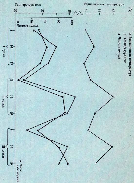 Этот процесс мы постоянно наблюдали во время экспериментов, причем нарастание частоты пульса шло почти параллельно с увеличением температуры тела (рис. 80). Интересно, что на вторые и третьи сутки эксперимента в утренние часы частота сердечных сокращений у испытуемых в покое была в некоторых случаях несколько ниже по сравнению с фоновой. Однако даже небольшая физическая нагрузка вызывала сердцебиение. Значительно учащался пульс при ортостатической пробе. Так, на третьи сутки эксперимента при переходе испытуемого из горизонтального положения в вертикальное частота пульса увеличивалась более чем в 2 раза.