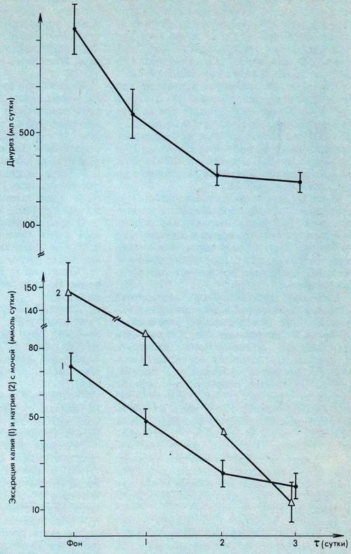 В наших экспериментах в пустыне при ограничении водопотребления до 1-1,5 л при температуре окружающей среды 42-44° диурез падал с 1000-1100 мл до 300-400 мл уже на вторые сутки. Содержание натрия в моче уменьшалось со 145 до 15-20 ммоль/сутки, а калия – с 70 до 20-30 ммоль/сутки. Динамика этих процессов представлена на рис. 81.