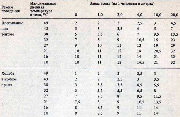 Таблица 3. Вероятные сроки (дни) автономного существования человека в пустыне в зависимости от температуры окружающей среды, имеющихся запасов воды и режима поведения