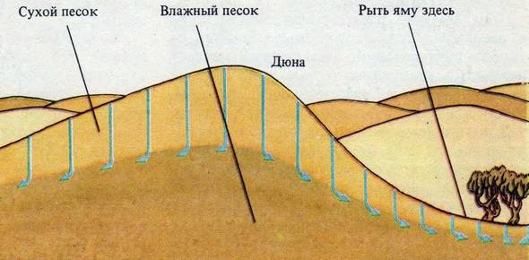 Поиск воды в пустыне труден, но не столь безнадежен, как это может показаться на первый взгляд. Но где же искать воду, если вокруг, казалось бы, нет ни единого признака ее: ни деревца, ни кустика, только бесконечные цепи желто-коричневых песчаных холмов – барханов? Однако порой стоит копнуть поглубже в низине старого высохшего русла или в ложбине у подножия бархана с подветренной стороны – и придет удача (рис. 82). Сначала на глубине одного-двух метров появится темный, сырой песок, а через некоторое время выкопанную ямку постепенно заполнит грунтовая вода. И не случайно казахи – знатоки природы пустыни говорят: «Кум бар – су бар!» Это значит: где песок – там вода!