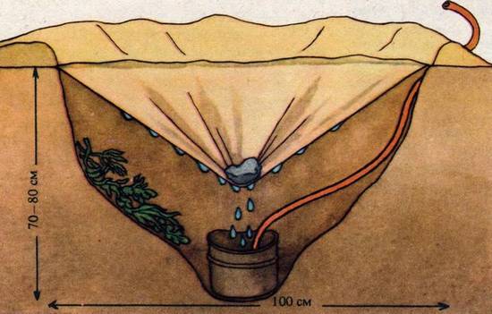 Между тем воду в пустыне можно получать прямо... из песка, с помощью так называемых солнечных конденсаторов. Дело в том, что песок никогда не бывает абсолютно сухим. Его капиллярные силы прочно удерживают небольшое количество влаги, которая, как это ни парадоксально, не испаряется в прокаленный, высушенный солнцем воздух пустыни. Основой конструкции солнечного конденсатора служит тонкая пленка из прозрачного, гидрофобного (водоотталкивающего) пластика. Ею прикрывается яма диаметром около метра, вырытая в грунте на глубину 50-60 см. Края пленки для создания большей герметичности присыпаются песком или землей. Солнечные лучи, проникая сквозь прозрачную мембрану, абсорбируют из почвы влагу, которая, испаряясь, конденсируется на внутренней поверхности пленки (рис. 84). Пленке придают конусообразную форму, положив в центр ее небольшой грузик, чтобы капли конденсата стекали в водосборник. Извлечь из него воду можно, не нарушая конструкции, с помощью специальной трубки. За сутки один конденсатор может дать до полутора литров воды. Для повышения его производительности яму наполовину заполняют свежесорванными растениями, побегами верблюжьей колючки и т.п. (Волович, 1976; Teagarden, 1976).