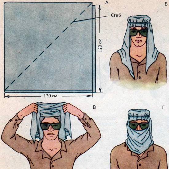 Вот почему дневной переход в пустыне допустим только в крайних обстоятельствах и лишь при условии, когда месторасположение населенного пункта, артезианской скважины или оазиса точно известно, расстояние до них не превышает 10-20 км, а состояние здоровья людей позволяет преодолеть его за 3-4 часа. С собой берут лишь самое необходимое – фляги с водой, аварийную радиостанцию и сигнальные средства. Голову, лицо и шею защищают от палящих солнечных лучей накидкой-бурнусом, которую выкраивают из любой имеющейся ткани. Чтобы песок при ходьбе не попадал в обувь, поверх нее надевают чехлы-бахилы из ткани, стянув их чуть выше лодыжек шнурками. Очки-светофильтры хорошо защищают глаза от слепящего света и мелкой песчаной пыли, а при их отсутствии глаза закрывают полосками ткани с узкими прорезями (рис. 92ж).