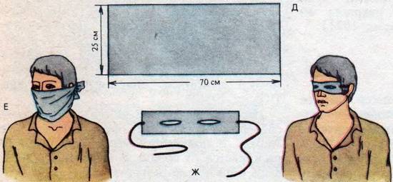 Рис. 92. Изготовление защитных повязок и очков из подручных средств: а – выкройка головной повязки, б – повязка на голову, в – защита головы и шеи от солнца и насекомых, г – бурнус, д – выкройка повязки на лицо, е – защита лица от ветра, ж – защитные очки из ленты (длина 15-20 см) с прорезями для глаз
