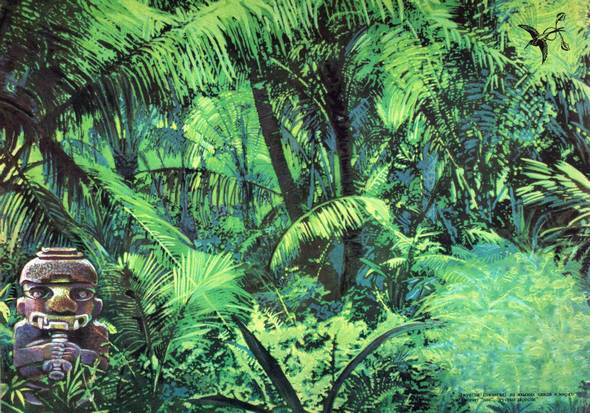 «Тяжелая сырость, сочащаяся по ветвям, хлюпающая, как набухшая губка, жирная почва, липкий густой воздух, ни звука, не шелохнется листок, не пролетит, не чирикнет птица. Зеленая, плотная, упругая масса мертво застыла, погруженная в кладбищенскую тишину... Как узнать, куда идти? Хоть бы какой-нибудь знак или намек – ничего. Полный враждебного безразличия зеленый ад» – так описывает джунгли французский публицист Пьер Рондьер (1967).