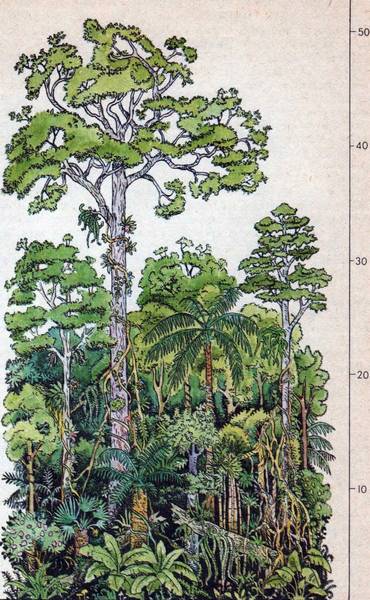 Второй ярус образуют деревья высотой до 20-30 м. Третий ярус представлен 10-20-метровыми деревьями, преимущественно пальмами различного вида. И наконец, четвертый ярус – это невысокий подлесок из бамбука, кустарниковых и травянистых форм, папоротников и плаунов (рис. 96).