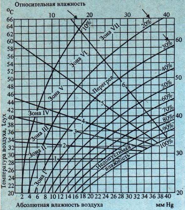 Рис. 97. График объективной оценки переносимости человеком высоких температур