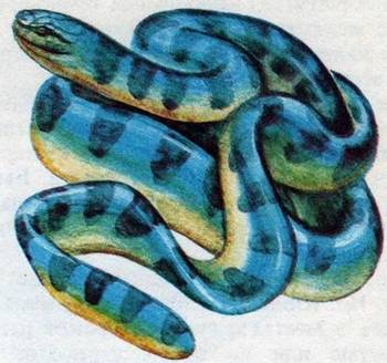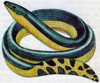 Морские змеи. В тропических водах Индийского и Тихого океанов, у Панамского перешейка и в Персидском заливе, у берегов Индии и Новой Гвинеи часто встречаются змеи, ведущие морской образ жизни. Это подсемейство змей – морские змеи (Hydrophidae) – насчитывает около 54 видов, из которых многие весьма опасны для человека. На первый взгляд морские змеи напоминают не столько своих земных сородичей, сколько угревидных рыб. Они невелики по размеру, лишь изредка попадаются экземпляры, достигающие 3 м. Тело их с небольшой головой, круглое в передней части и сильно сплющенное с боков в средней, заканчивается коротким плавательным хвостом, напоминающим лопасть весла, поставленную вертикально.
