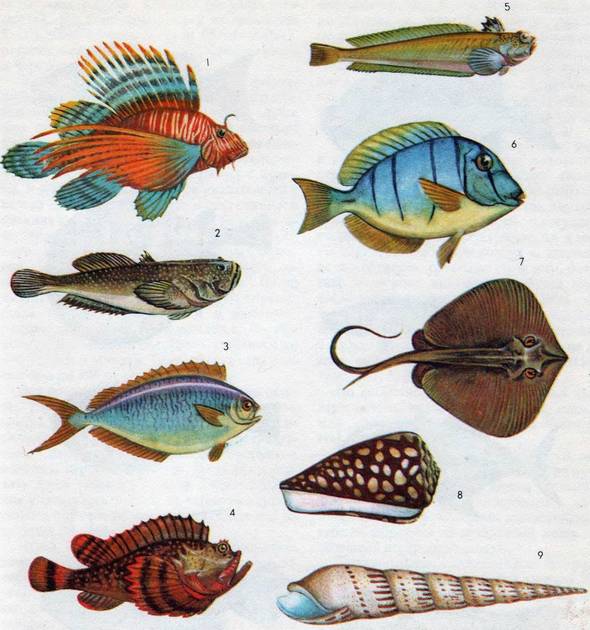 Рис. 141. Рыбы и моллюски с ядовитыми шипами: 1 – крылатка, 2 – талассофрина, 3 – зиган, 4 – камень-рыба, 5 – морской дракончик, 6 – хирург, 7 – скат, 8 – конус, 9 – теребра