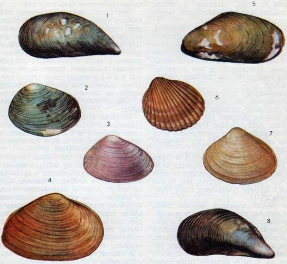 Рис. 143. Моллюски: 1 – съедобная мидия, 2 – синяя ракушка, 3 – донакс, 4 – мия, 5 – волселла, 6 – сердцевидка, 7 – спизула, 8 – калифорнийская мидия