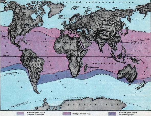 Рис. 145. Области Мирового океана, где зарегистрировано нападение акул на человека