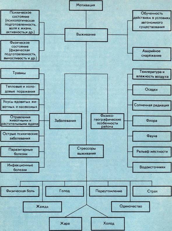 Немаловажную роль будут играть природные условия района бедствия: температура и влажность воздуха, солнечная радиация, растительность, водоисточники и т.д. Все эти причины объективного и субъективного характера, обусловливающие исход автономного существования, носят название факторов выживания (рис. 2).